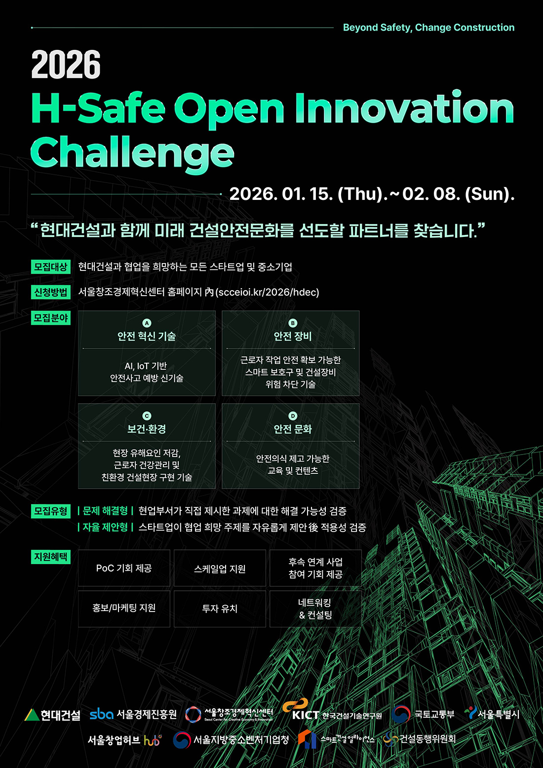 또한 3개 기관과 함께 국내 최초로 ‘건설 안전’을 주제로 한 오픈이노베이션 프로그램인 『2026 H-Safe Open Innovation Challenge』 공모전을 공동 개최한다. 모집 분야는 ▲안전 혁신 기술 ▲안전 장비 ▲보건·환경 ▲안전 문화 등 총 4개 분야며, 접수 기간은 15일부터 다음 달 8일까지다.