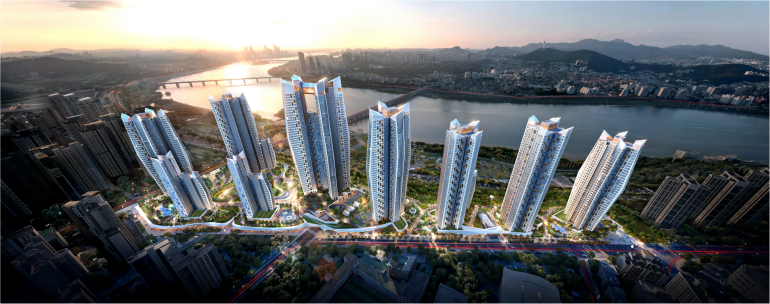 사업지는 한강에 접한 길이가 700여 미터에 달하는 입지적 강점을 가졌습니다. 현대건설은 이러한 입지를 활용하기 위해 대지 레벨을 높이고 필로티를 적용해 전 세대 100% 한강 조망이 가능하도록 설계했습니다.